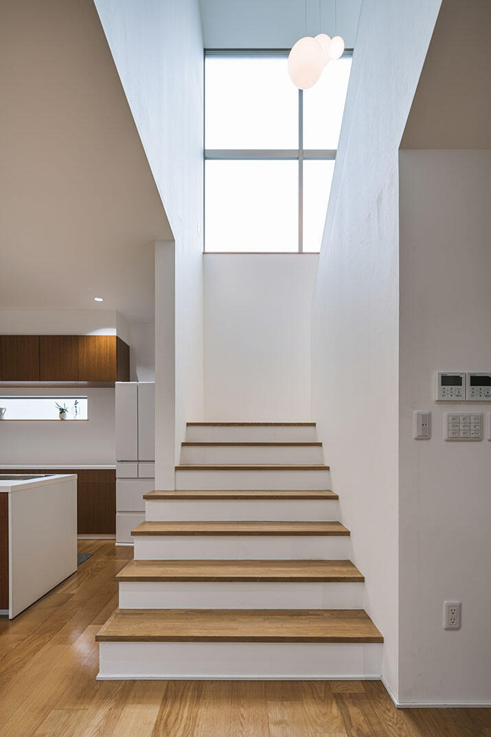 1Fは洗練された機能美が整うキッチン。リビングダイニングにはテラスからやわらかな光がそそぎ、そこにはシンプルで上質な北欧家具たち。